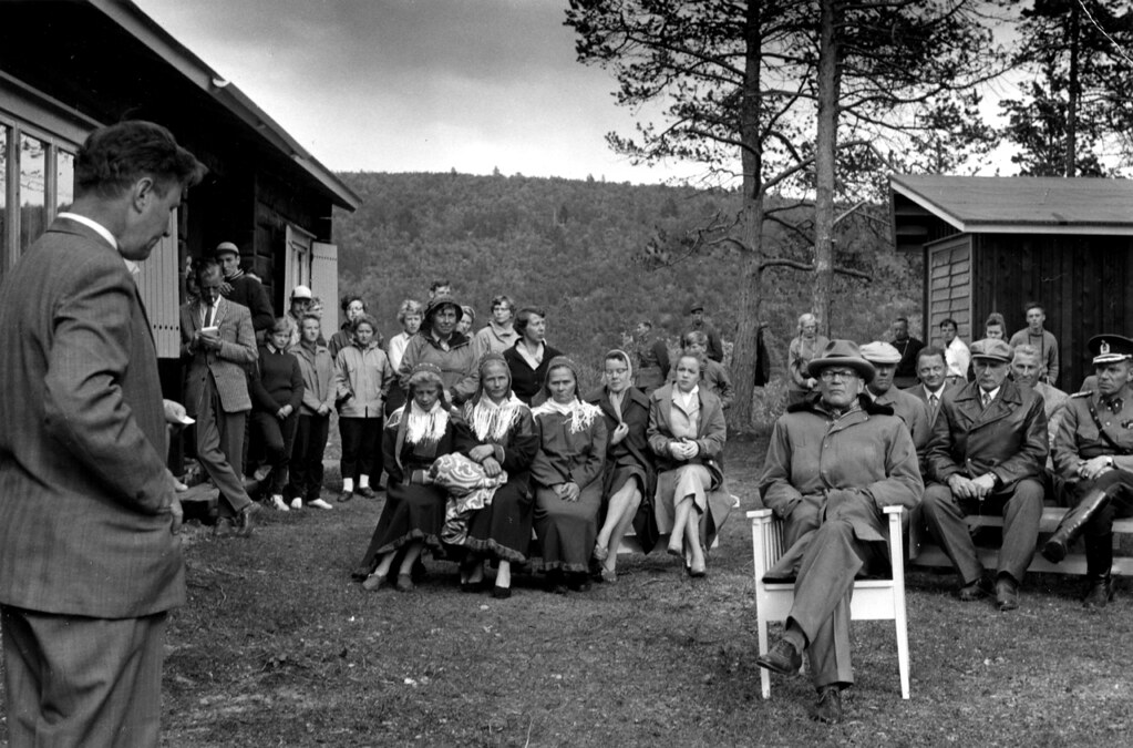 Kevon tutkimusaseman vihkiäisiä viettoa kesällä 1958. Presidentti Urho Kekkonen osallistui tilaisuuteen. Professori Paavo Kallio on pitämässä tervehdyspuhetta.