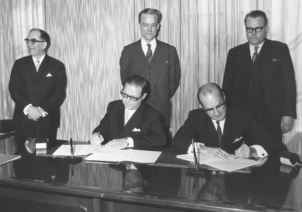 Esisopimusta Turun Yliopiston valtiollistamiseksi allekirjoitetaan Valtioneuvoston juhlahuoneistossa 29. huhtikuuta 1971.