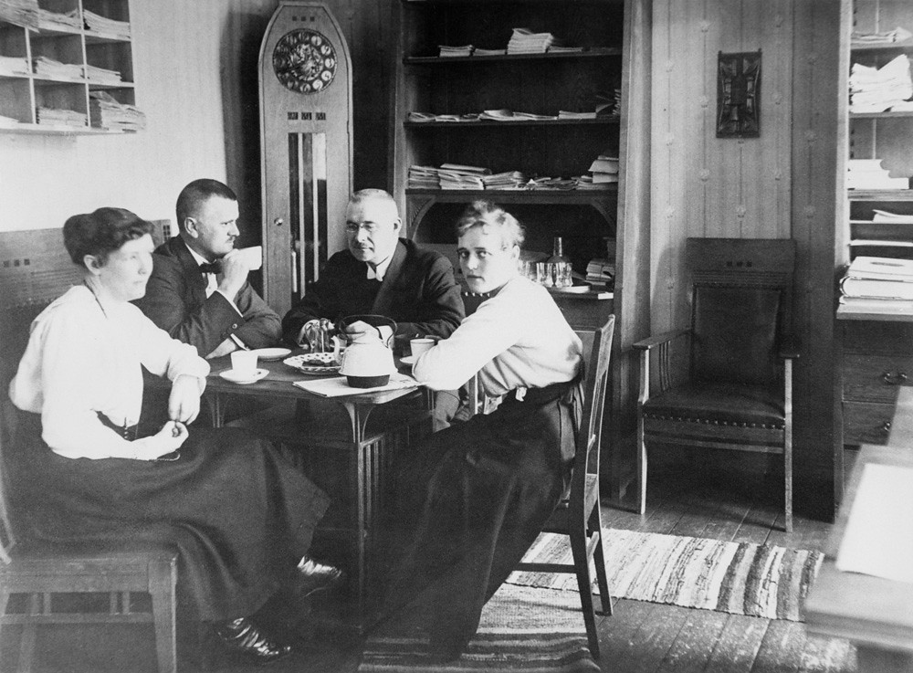 Turun Suomalaisen Yliopistoseuran kirjanpitäjä/kassanhoitaja Anni Saarento (vas.), sihteeri Kaarlo Jäntere, kamreeri Kaarlo Österbladh ja toimistoapulainen Kyllikki.