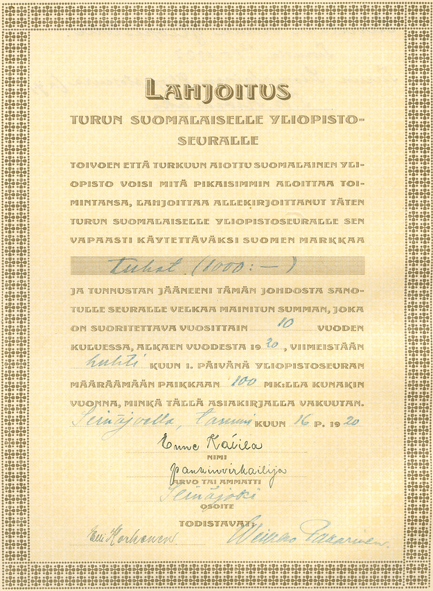 Seinäjoella 16.1.1920. tehty sadan markan kymmenen vuoden vuosilahjoitus Turun Suomalaiselle Yliopistoseuralle.