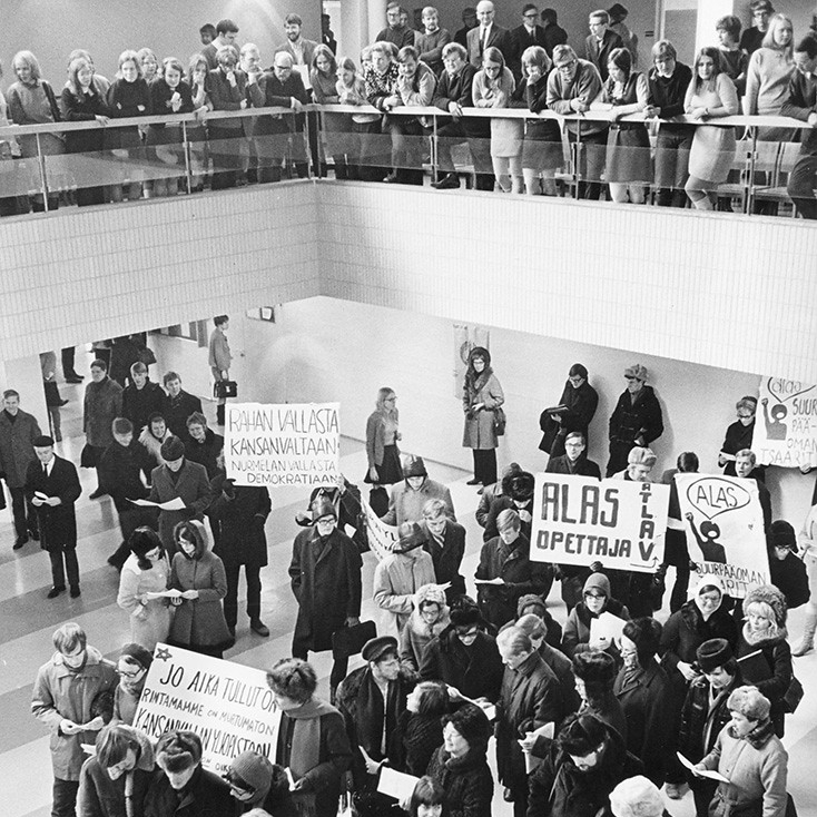 Opiskelijoiden mielenosoitus päärakennuksella hallinnonuudistuspäivänä v. 1970.