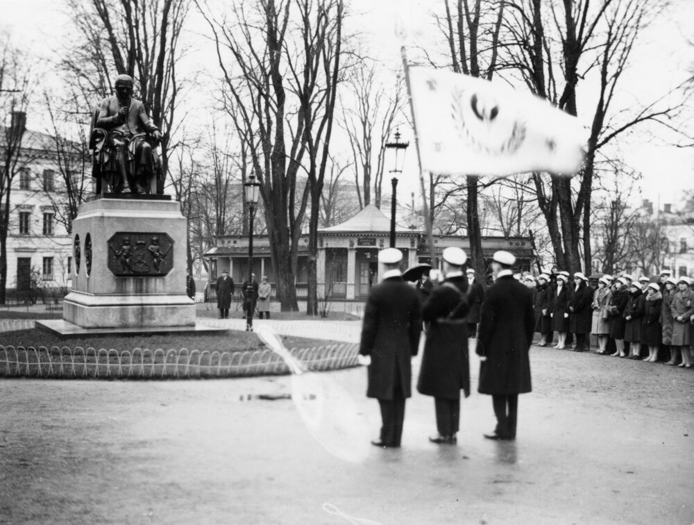 Ylioppilaskunnan vuosijuhlakulkue Porthanin patsaalla 1930-luvun alkupuolella.