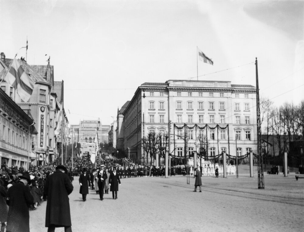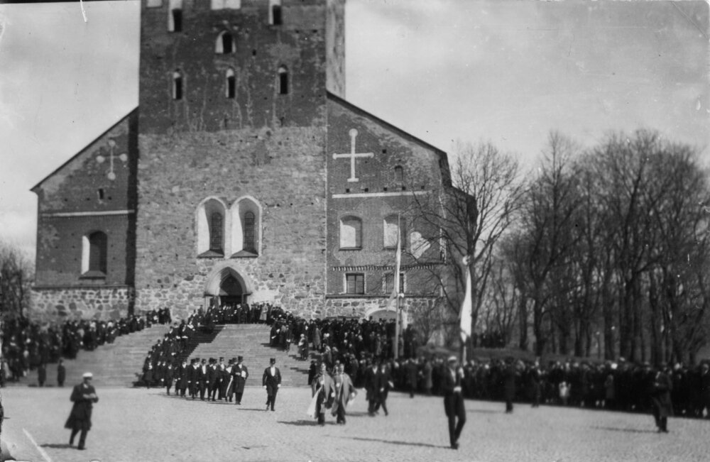 Yliopistollisen kulkue palaa tuomiokirkosta promootiojumalanpalveluksen jälkeen. Yliopiston vihkiäisjuhla ja ensimmäinen promootio 12. toukokuuta 1927.
