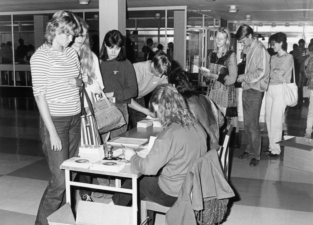 Opiskelijoita ilmoittautumassa yliopistoon avajaispäivänä v. 1983.