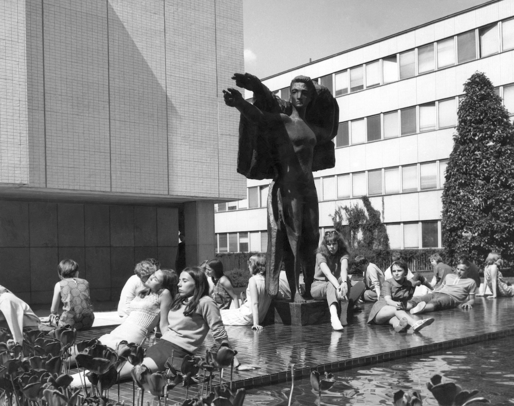 Opiskelijoita yliopistonmäen keskusaukion suihkualtaan reunustalla kesällä 1960-luvun lopulla. Kuvan keskellä Väinö Aaltosen veistos "Genius ohjaa nuoruutta". Lisätietoa veistoksesta