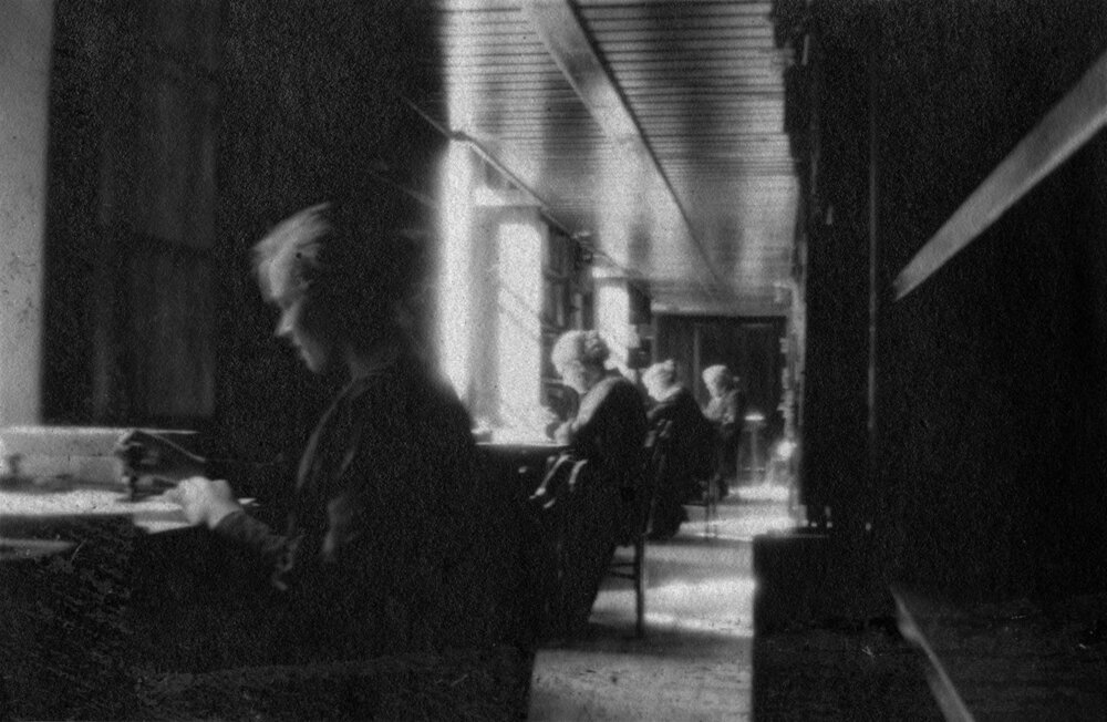 Työskentelyä Phoenixin kirjastohuoneiston varastokäytävän ahtaissa oloissa 1920-luvun alussa.