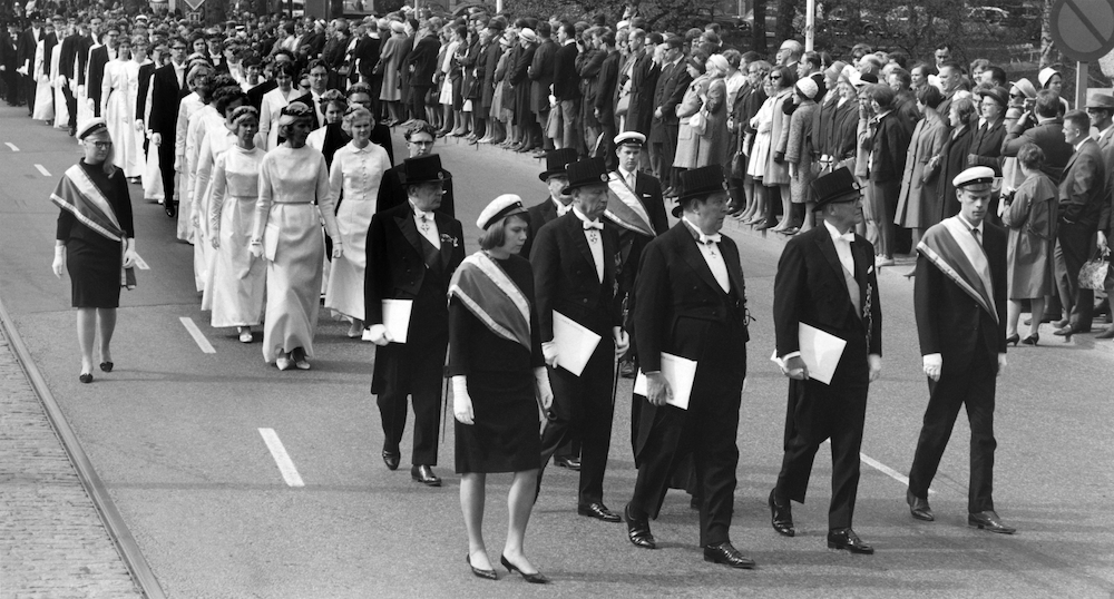 Kulkue saapumassa Tuomiokirkkosiltaa pitkin vuoden 1965 promootiossa. Etualalla kunniantohtoreita, mukaan lukien presidentti Urho Kekkonen.