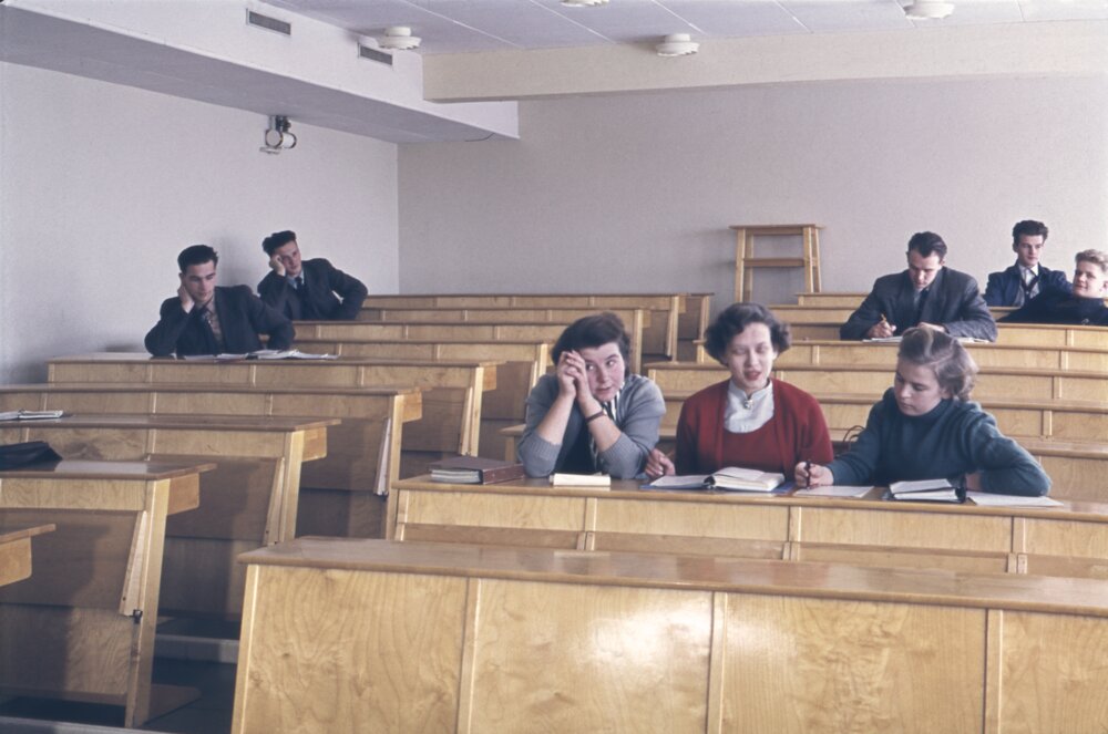 Opiskelijoita upouudessa luentosalissa Yliopistonmäellä 1950-luvun lopulla.