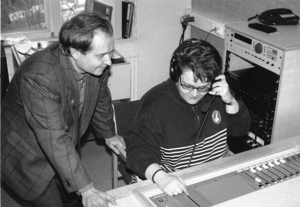 Radio Aurora aloitti toimintansa 19.1.1996 tiede- ja kulttuuriradiona yhteistyössä Yleisradion kanssa. Kuvassa testataan lähetyspöydän toimintaa uudessa lähetysstudiossa Radio Auroran perustamisvuosina.