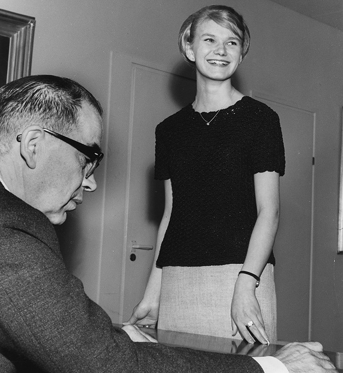 Turun yliopiston kymmenestuhannes opiskelija Marita Halonen rehtori Nurmelan vastaanotolla 7. syyskuuta 1964.