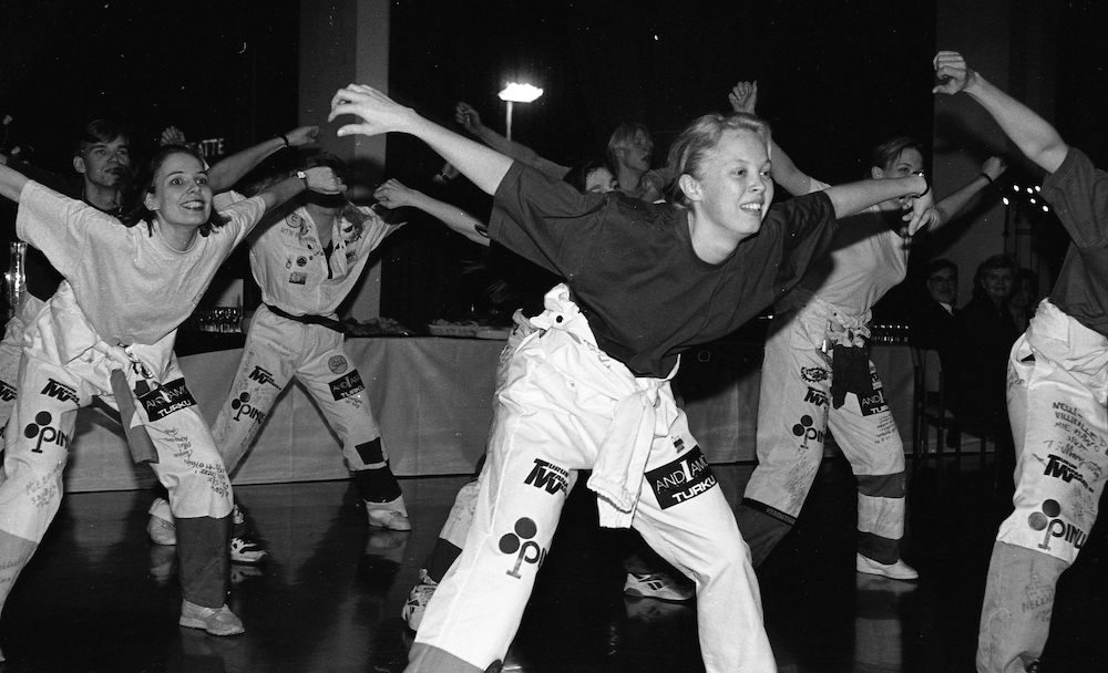Energiset OKL:n tanssijat esiintyivät Turun yliopiston 75. vuosijuhlien iltamilla v. 1995.