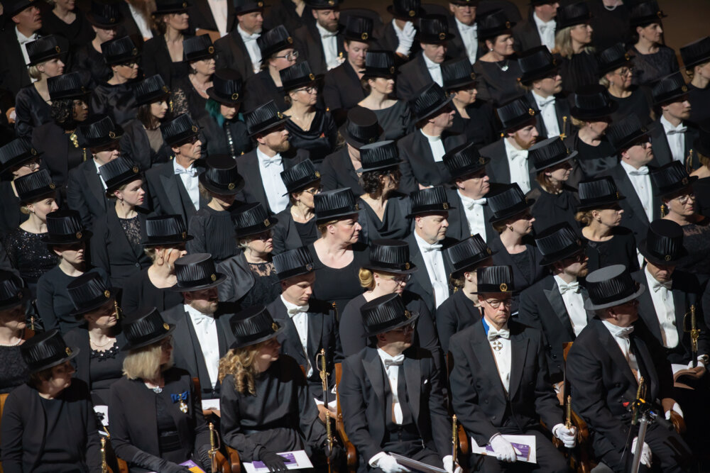 Promovendejä istumassa, etualalla kunniatohtoreita. Vuoden 2022 promootio.