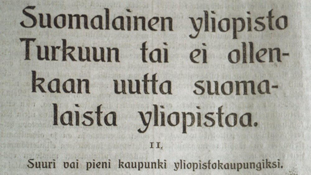 Idea suomenkielisestä yliopistosta omaa juuret jo vuoteen 1821, kun turkulaiset romantikot ehdottivat suomen kielen aseman kohottamista sivistyksen kieleksi. Kuvassa K. N. Rantakarin julistus Uuden Auran loppusyksyn numerossa v. 1913.