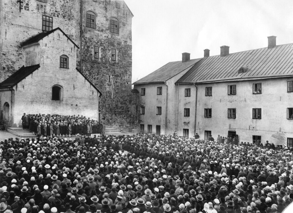 Kuorojen yhteiskonsertti Turun linnan pihalla yliopiston ensimmäisen promootion toisena juhlapäivänä v. 1927. Esitystä kerääntyi katsomaan kolmisentuhatta kuulijaa.