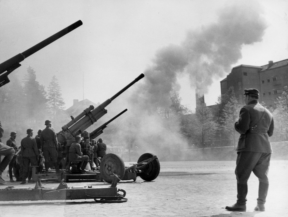 Konserttitalon taakse Parkkimäen kentälle sijoitettu patteristo ampuu kunnialaukauksia vuoden 1960 promootiossa.