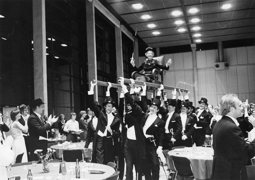 Promootiotanssiaiset kongressikeskus Ikituurissa. Kultatuolissa istuu kunniatohtori, YK:n apulaispääsihteeri Helvi Sipilä. Vuoden 1977 promootio.