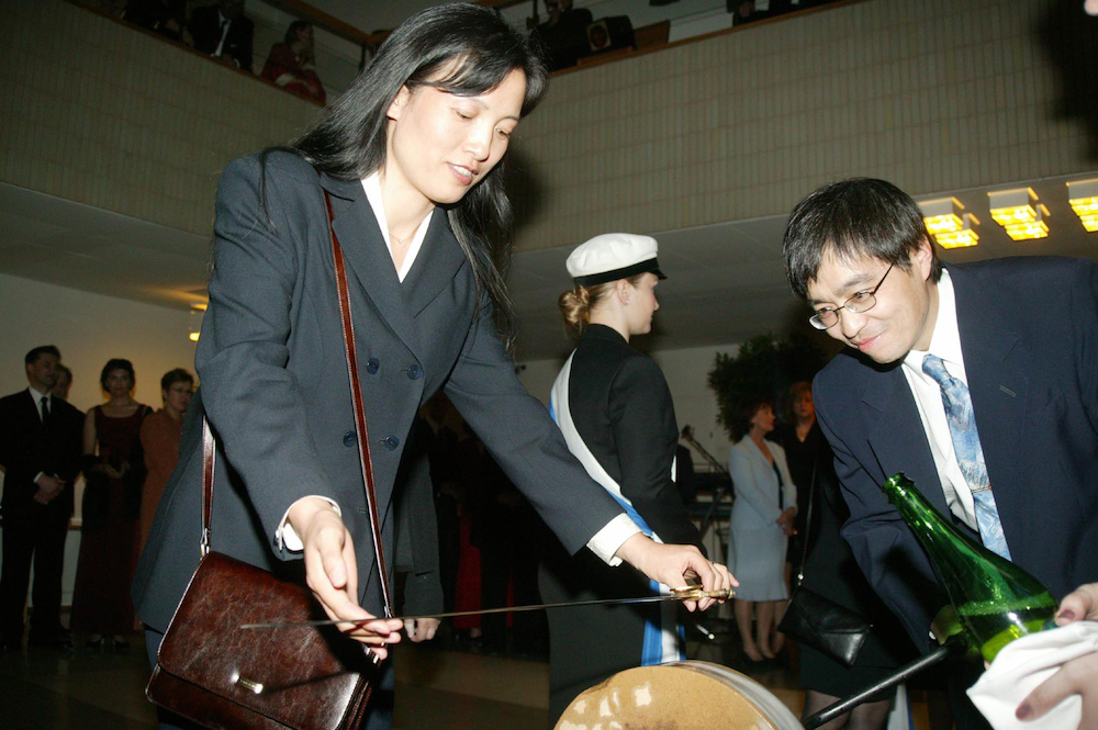 Miekanhiojaiset vuoden 2003 promootiossa: tyrnimarjan ominaisuuksista väitellyt Baoru Yang hioo miekkaansa Liedon Vanhalinnasta tuodulla tahkolla yliopiston päärakennuksen aulassa.