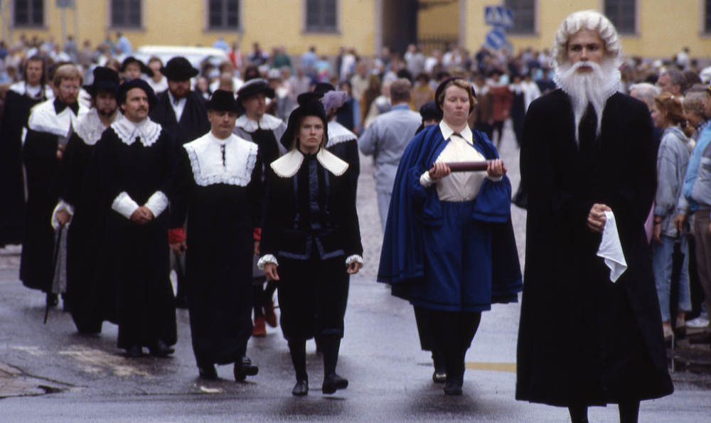 Kuvassa piispa Isaac Rothovius, akatemian tohtori ja rehtori, sekä professorit osallistumassa vuoden 1990 promootion yhdistettyyn Turun Akatemian 350-vuotisjuhlakulkueeseen.