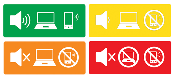 - Keltaisissa tiloissa on sallittu hillitty keskustelu ja läppärin käyttö, mutta ei puhelimen käyttö. (Kirjastojen aineistotilat)