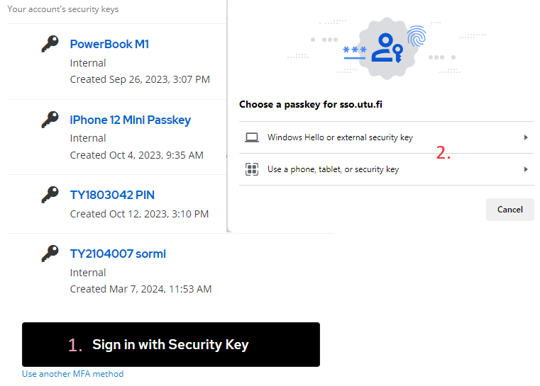 "Security key" -listassa näet tunnuksellesi rekisteröidyt pääsy- ja suojausavaimet. Listasta ei voi valita tiettyä todennuskeinoa, vaan selain tarjoaa käytettävissä olevia menetelmiä. Paina "Sign in with Security Key" -nappia (1.), valitse haluatko kirjautua pääsy- vai suojausavaimella (2.) ja noudata selaimen ohjeita käyttämällesi MFA-menetelmälle.