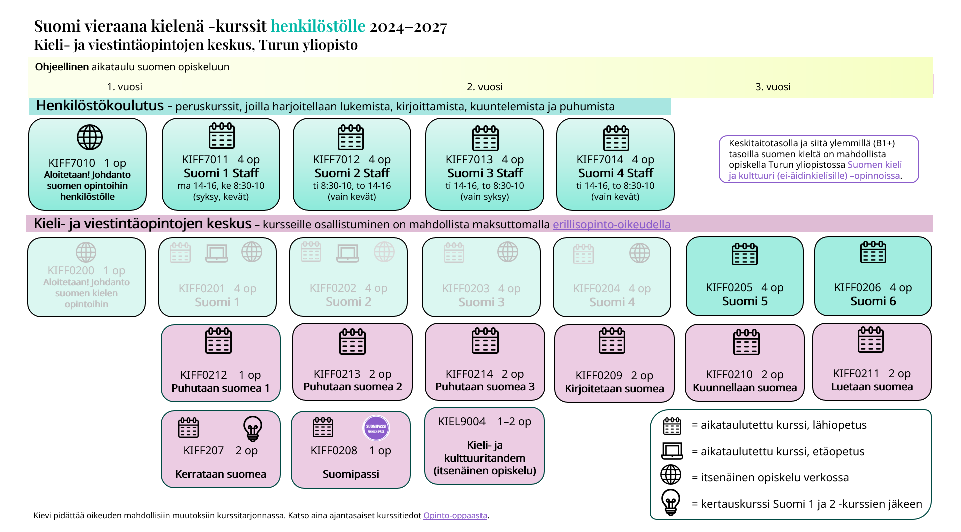Voit aloittaa suomen opinnot henkilöstölle räätälöidyillä suomen kursseilla. Katso opinto-oppaasta lisätietoa henkilöstön kieli- ja viestintäopinnoista. Ilmoittautuminen kursseille tapahtuu Konstassa (vaatii kirjautumisen). Myös Turun yliopiston apurahatutkijat ja vierailevat tutkijat ovat tervetulleita henkilöstökursseille. Suomen kurssit ovat mainio tilaisuus verkostoitua Turun yliopistossa omaa yksikköä laajemmin!