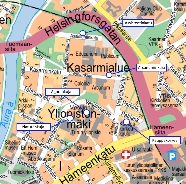 - Kampuksen läheisyydestä löytyy jonkin verran myös kaupungin maksuttomia tienvarsipaikkoja.