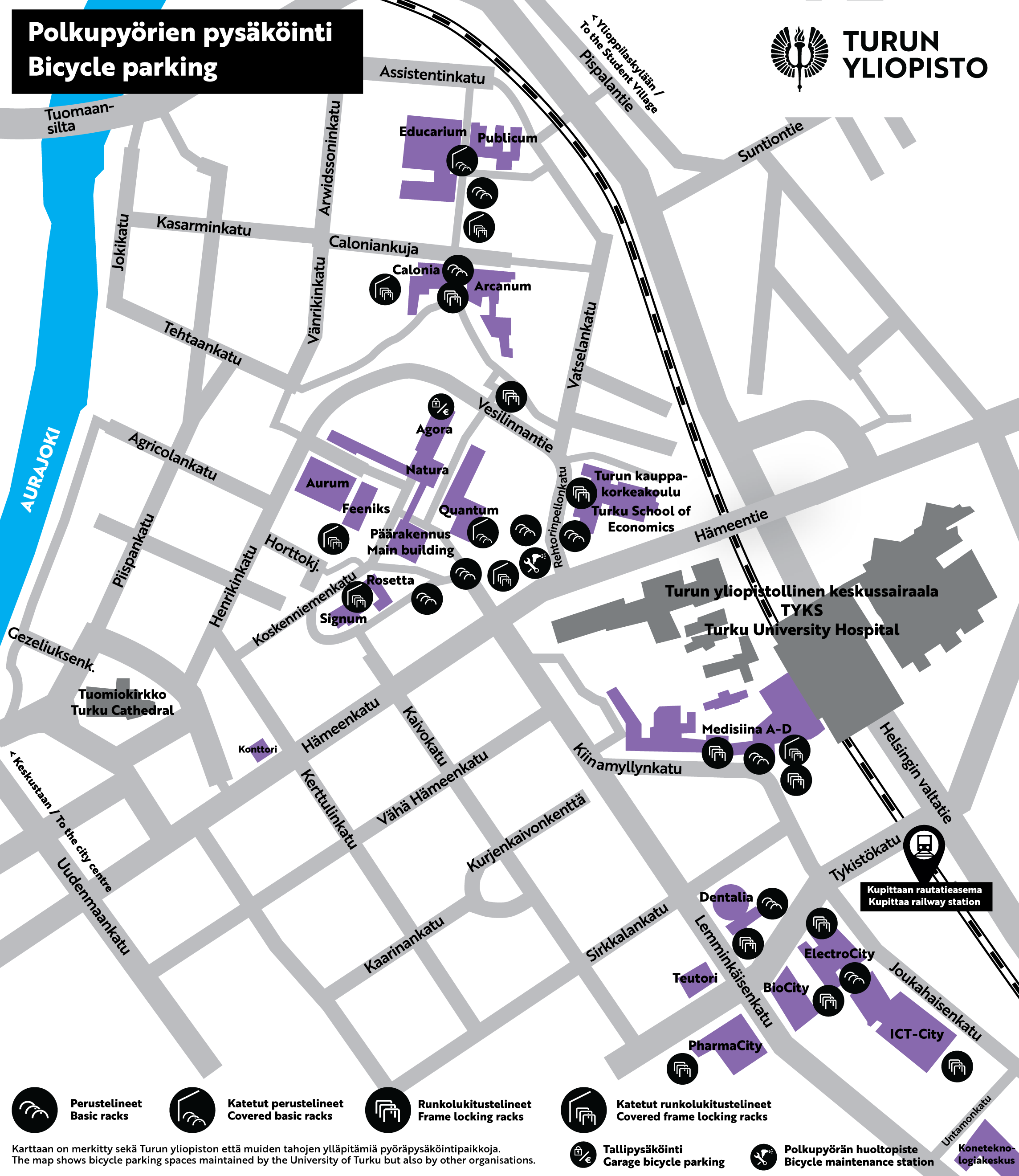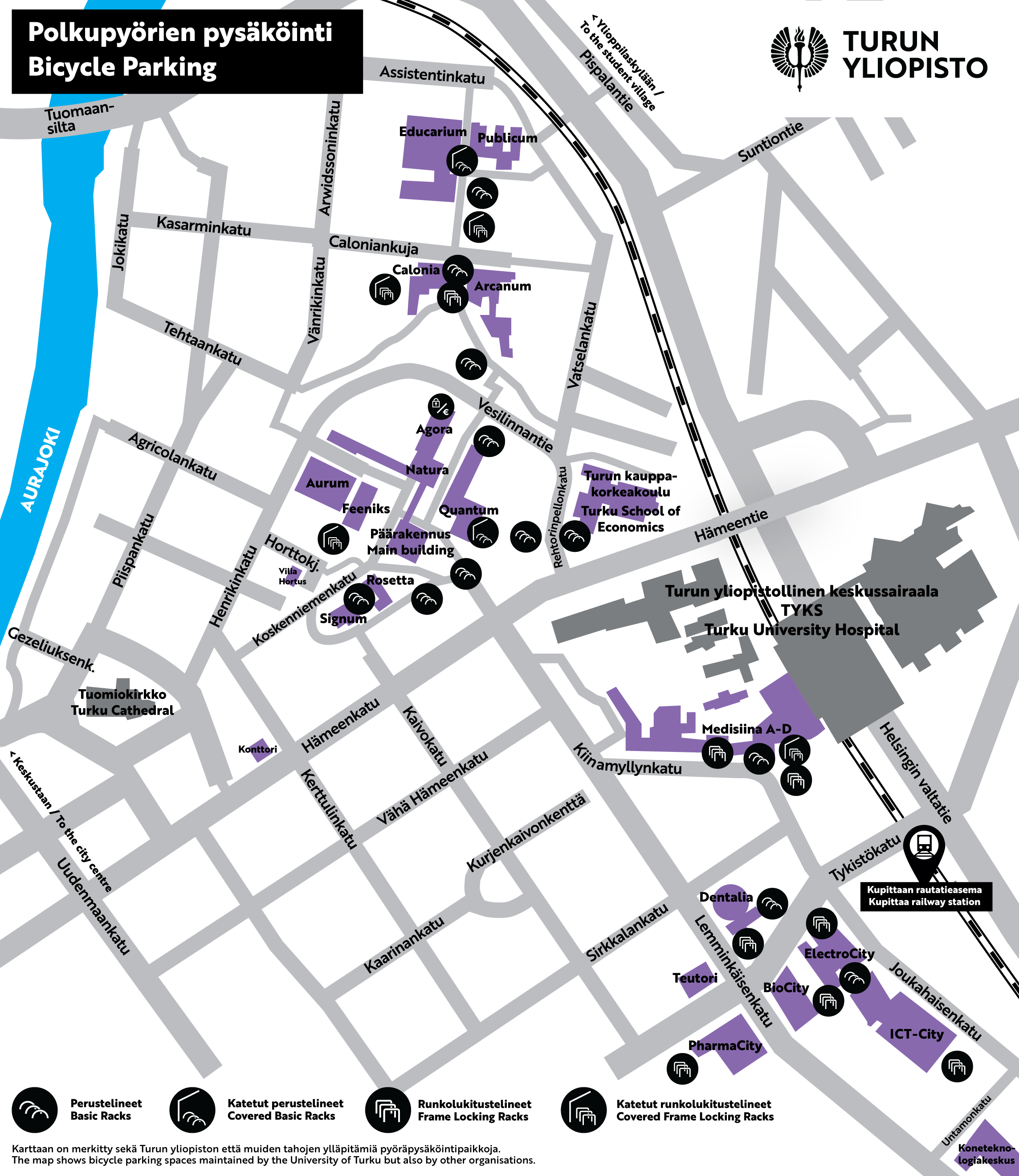 - Turun yliopistolle saapuvat pyöräilijät voivat pysäköidä kulkuneuvonsa eri puolilta kampusaluetta löytyviin pyörätelineisiin.