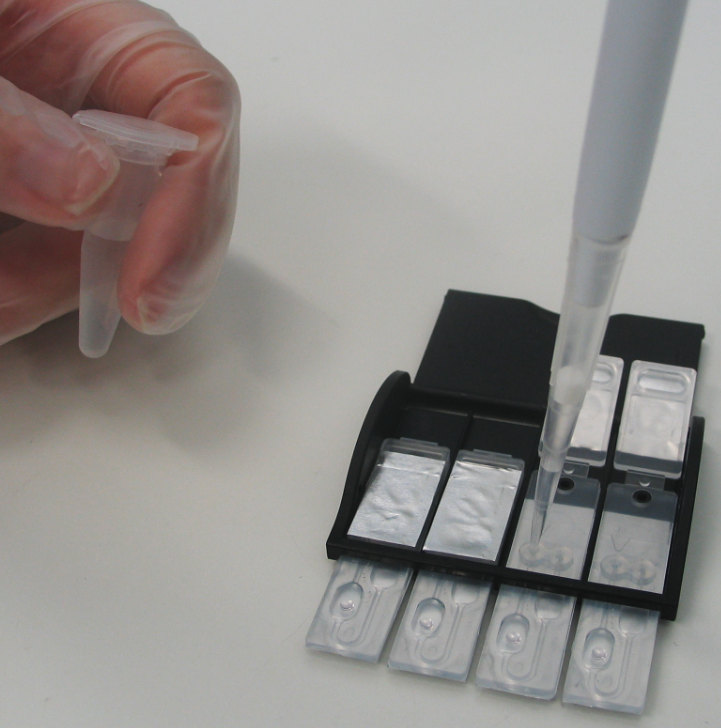 The current version of the test utilizes a disposable assay chip (Figure 1) and an integrated time-resolved fluorescence PCR device. The short (~100 bp) amplicon and simplified assay designs allows the assay to be adapted to any nucleic acid assay platform selected by the licensee.